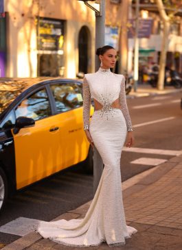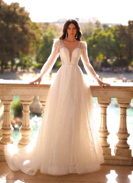Descoperă eleganța și rafinamentul acestei rochii de mireasă A-line, care îmbină perfect tradiția cu un aer modern. Fusta delicată din chiffon se așterne suav, oferind un fluiditate deosebită la fiecare pas, creând o siluetă grațioasă și etereală. Manecile lungi din dantelă adaugă un farmec vintage, îmbrăcând brațele cu un detaliu sofisticat, iar textura fină a dantelei completează cu măiestrie aspectul romantic al rochiei.