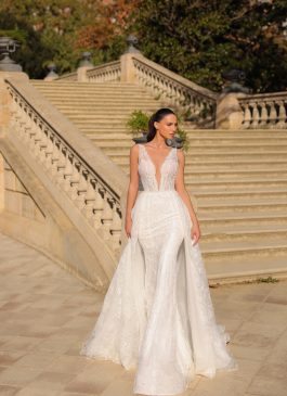 Rochia de mireasă lungă tip sirena, realizată dintr-o dantelă fină și elegantă, emană feminitate și rafinament. Corsetul cu decolteu adânc și spate în V pune în valoare silueta, conferind un aspect senzual și atrăgător. Bretelele subțiri asigură o susținere optimă, oferind totodată un aer grațios și sofisticat. De asemenea, această rochie de mireasă beneficiază de o trena detasabilă opțională, care poate fi adăugată pentru a amplifica eleganța și splendoarea ansamblului. Un design desăvârșit pentru o apariție spectaculoasă în ziua cea mare.