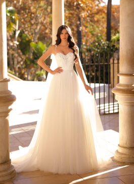 Rochia de mireasă este o creație elegantă și sofisticată, perfectă pentru femeile moderne și rafinate. Corsetul realizat cu balene subtile, în forma unei inimi, adaugă o notă romantică și atrăgătoare. Acesta este decorat cu pietre prețioase ce strălucesc delicat în lumină, conferind o notă de glamour rochiei. Bretelele subțiri pe umeri adaugă o notă feminină și subtilă. Deasupra bretelelor, se poate adăuga un accesoriu tip aripioară care se montează cu ușurință. Această adiție înclină în favoarea unei stilizări unice și elegante pentru ziua cea mare.