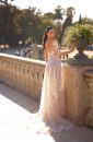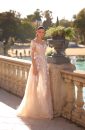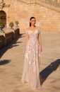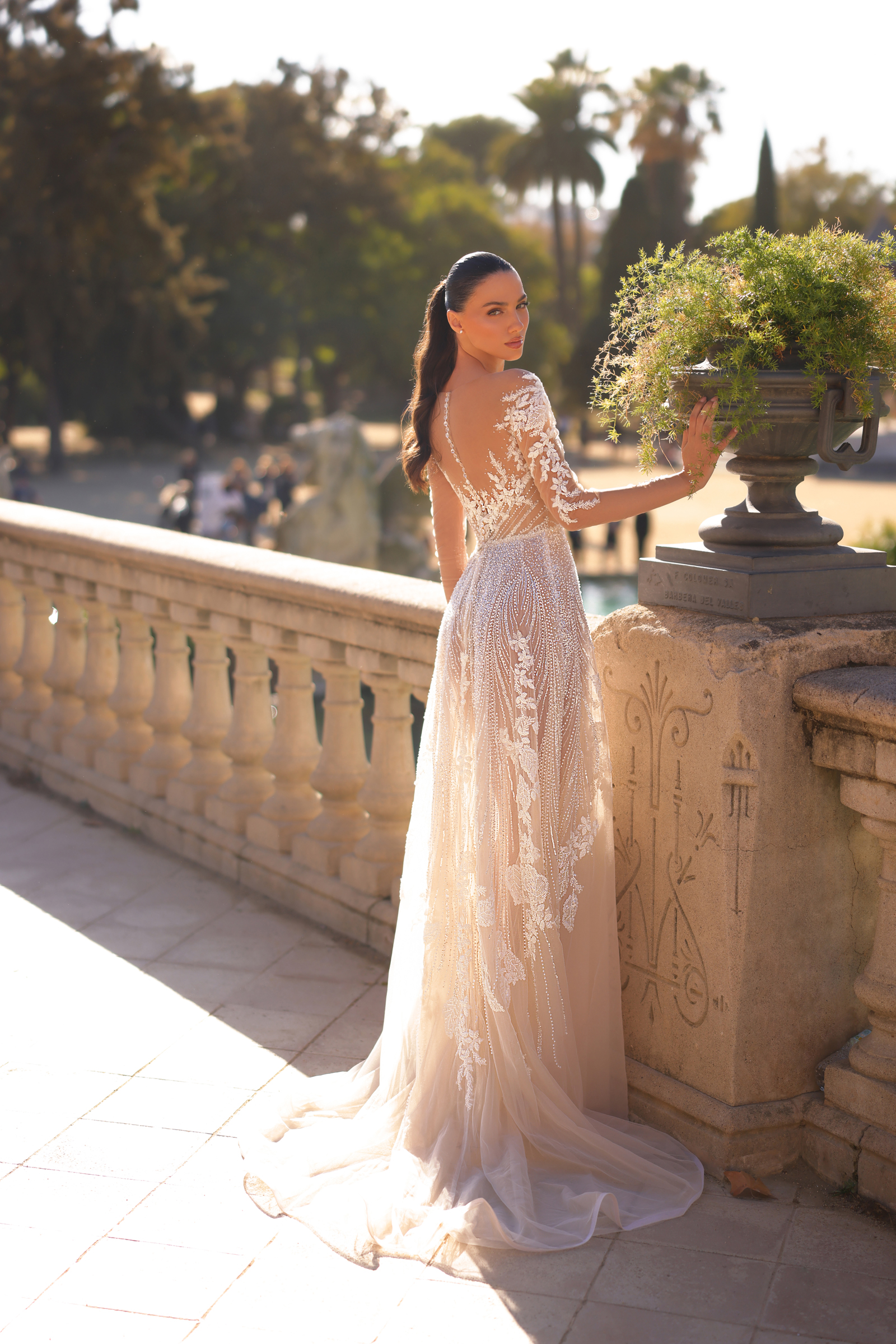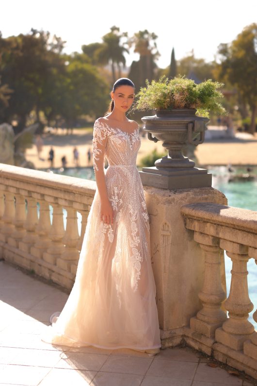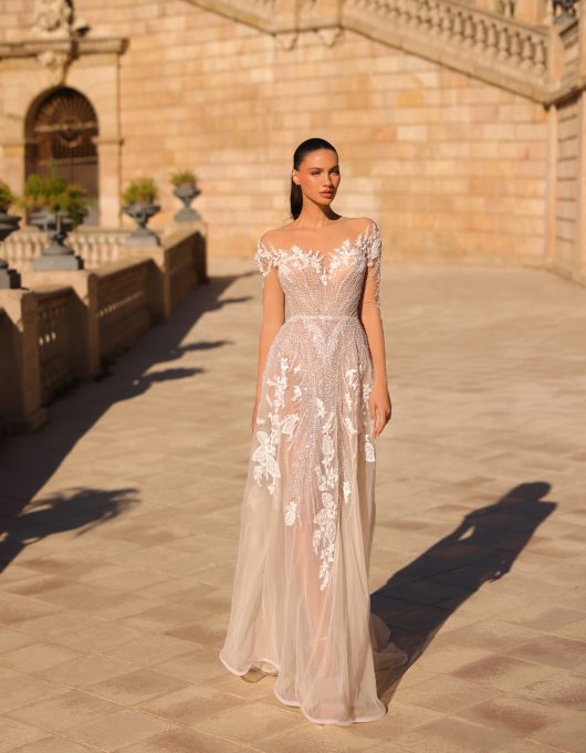 Rochia de mireasă A-line este o alegere clasică și elegantă, cu un aspect atemporal. Lunga și fluidă, aceasta conferă o nota de eleganță și subtilitate. Cu manecile lungi transparente decorate cu dantelă inflorată, aceasta adaugă un element romantic și feminin rochiei. În spate, prezintă o închidere cu nasturi, evidențiind un detaliu discret și sofisticat. Această rochie de mireasă combină perfect elementele tradiționale cu un design modern și rafinat.