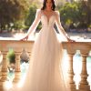 Rochia de mireasă A-line este o alegere clasică și elegantă, cu un aspect atemporal. Lunga și fluidă, aceasta conferă o nota de eleganță și subtilitate. Cu manecile lungi transparente decorate cu dantelă inflorată, aceasta adaugă un element romantic și feminin rochiei. În spate, prezintă o închidere cu nasturi, evidențiind un detaliu discret și sofisticat. Această rochie de mireasă combină perfect elementele tradiționale cu un design modern și rafinat.