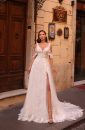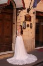 Rochia de mireasa Clover este o printesa clasica si deosebita. Dantela fina cu pietre este aplicata pe fusta si bust, imbracand rochia intr-un mod elegant. Spatele transparent creaza din dantela o inimioara romantica iar centura din tafta cu brosa din strasuri pune talia in evidenta.