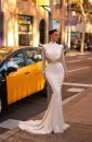 Rochia de mireasă sirena este o creație fascinantă ce emană eleganță și rafinament. Această rochie captivează privirile cu decupaje subtile în lateralul bustului, subtil subliniind silueta ondulantă a miresei. Cu un guler înalt, aceasta adaugă o notă de mister, completată perfect de mâneci ușor transparente ce redau o finețe inegalabilă. Cu spatele gol elegant dezvăluit în partea de talie, această rochie emana senzualitate și feminitate irezistibilă. O alegere perfectă pentru miresele în căutare de romantism și unicitate în ziua cea mare.
