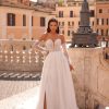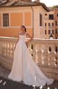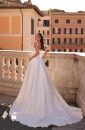 Rochia de mireasa Palencia se impune prin simplitatea si eleganta sa. Bustul este creat din dantela delicata cu pietre aplicata pe tulle nude care se imbina perfect cu fusta simpla cu un strat de tulle cristal si trena diafana.