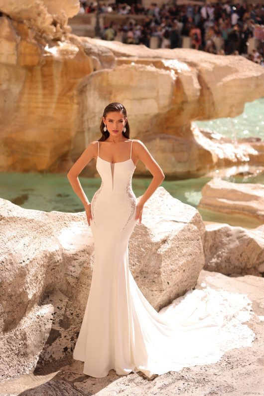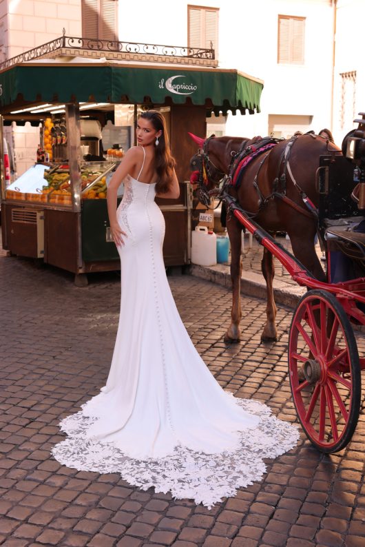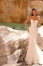 Rochia de mireasă lungă în stil sirena este o creație spectaculoasă, confecționată dintr-o dantelă fină și romantică. Slipitoarea subțire evidențiază silueta și conturează formele într-o manieră subtilă și fermecătoare. Adăugând un accesoriu de tip mâneci lungi, care căzând până la pamant, conferă un aer elegant și misterios întregii ținute. Această rochie este un simbol al feminității și rafinamentului, captând toate privirile și creând o amintire de neuitat pentru mireasa din acest moment special al vieții sale.