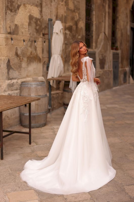 Culoarea ivory emană puritate și eleganță, fiind alegerea perfectă pentru o zi atât de specială. Spatele rochiei, închis cu un tulle nude delicat și împodobit cu nasturi, adaugă un strop de mister și un accent chic, lăsând o impresie de neuitat. Această rochie nu este doar un articol vestimentar, ci o poveste de dragoste materializată, pregătită să te învăluie în frumusețe și să îți însoțească pașii spre altar cu grație și stil. Fiecare detaliu a fost gândit cu atenție, pentru a te face să te simți ca o adevărată prințesă în cea mai importantă zi din viața ta.