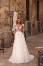 Descoperă eleganța și rafinamentul acestei rochii de mireasă A-line, care îmbină perfect tradiția cu un aer modern. Fusta delicată din chiffon se așterne suav, oferind un fluiditate deosebită la fiecare pas, creând o siluetă grațioasă și etereală. Manecile lungi din dantelă adaugă un farmec vintage, îmbrăcând brațele cu un detaliu sofisticat, iar textura fină a dantelei completează cu măiestrie aspectul romantic al rochiei.
