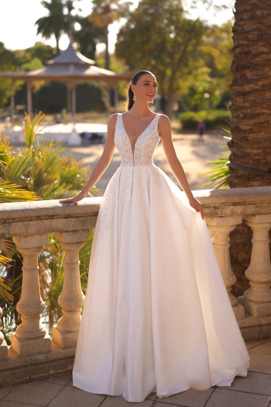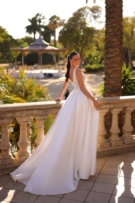 Rochia de mireasă printesa este un adevărat regal al eleganței și rafinamentului. Cu un bust cu bretele, realizat integral dintr-o dantelă fină și delicată, aceasta emană feminitate și grandoare. Dantela coboară grațios pe fusta simplă, conferind un aspect romantic și sofisticat întregii creații. Croiala de tip printesa accentuează talia și subliniază silueta, în timp ce lungimea rochiei până la podea îi conferă o vizualizare demnă de basm. O alegere perfectă pentru miresele care visează să se simtă ca adevărate prințese în ziua cea mare.