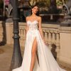 Rochia de mireasă printesa este un adevărat regal al eleganței și rafinamentului. Cu un bust cu bretele, realizat integral dintr-o dantelă fină și delicată, aceasta emană feminitate și grandoare. Dantela coboară grațios pe fusta simplă, conferind un aspect romantic și sofisticat întregii creații. Croiala de tip printesa accentuează talia și subliniază silueta, în timp ce lungimea rochiei până la podea îi conferă o vizualizare demnă de basm. O alegere perfectă pentru miresele care visează să se simtă ca adevărate prințese în ziua cea mare.
