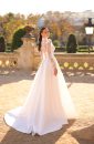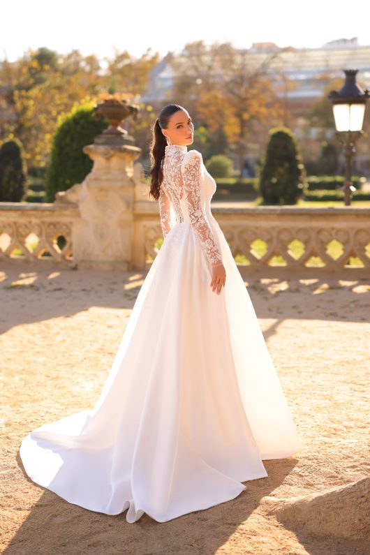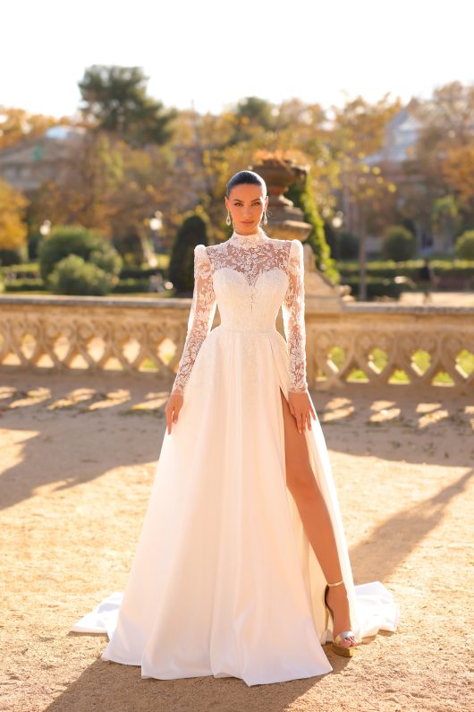 Rochia noastră de mireasă este o piesă sofisticată și elegantă, ideală pentru o mireasă care caută acel aspect regal. Aceasta are maneci lungi, care adaugă un aer romantic și delicat, iar dantela subtilă de pe gât conferă o notă feminină. Bustul este îmbrăcat într-o dantelă continuă, care coboară pe fustă, creând o armonie fluidă între cele două elemente. O caracteristică uimitoare este crapatura pe picior, care adaugă o tentă sexy și modernă acestei rochii tradiționale. Spatele plin de dantelă este delicat închis cu rânduri discrete de nasturi, oferind un detaliu subtil și irezistibil.