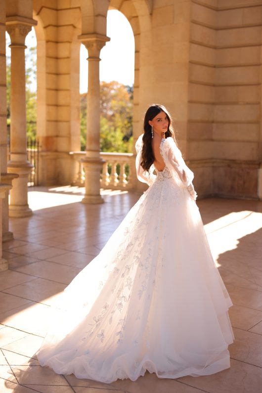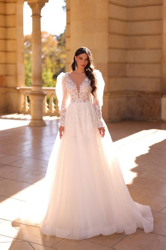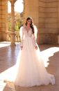 Rochia de mireasă cu maneci lungi ușor bufante și dantelă la încheietura mâinilor este o alegere elegantă și sofisticată pentru o zi specială. Bustul acesteia este delicat decorat cu dantelă fină și cu bretele subțiri, care coboară într-un mod subtil pe fustă. Detaliile romantice și cusăturile atent lucrate subliniază feminitatea și grandoarea, adăugând o notă de rafinament. Această rochie amplă și lejeră aduce un aer nobil și este ideală pentru o mireasă care dorește să se simtă ca o prințesă în ziua cea mare.