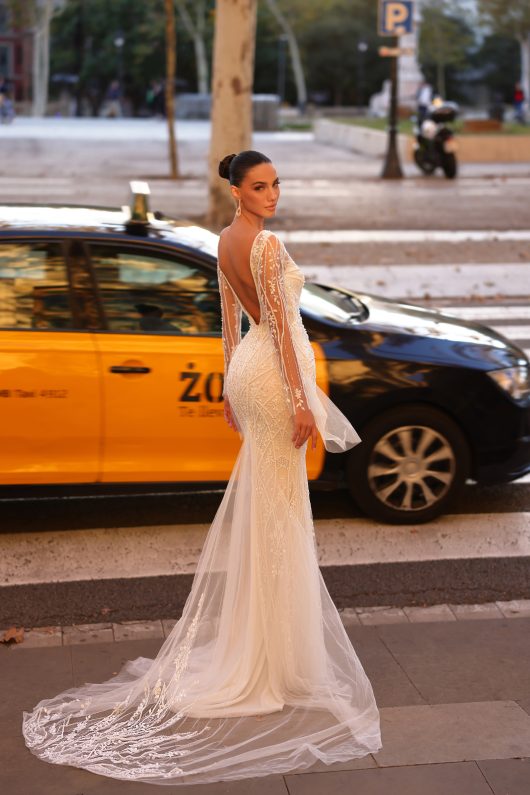 Rochia de mireasă lungă tip sirena este o creație impresionantă și atrăgătoare. Fabricată dintr-o dantelă delicată și rafinată, această rochie emană eleganța și feminitatea perfectă pentru o mireasă. Cu maneci lungi, acest model adaugă o notă de sofisticare și rafinament. Decolteul în V subțiază frumos silueta, oferind un aer senzual și seducător. Pe lângă aceste detalii, spatele gol adaugă o notă irezistibilă și îi oferă rochiei un aspect uimitor în orice unghi. Această rochie de mireasă este un adevărat vis devenit realitate pentru orice femeie care dorește să strălucească în ziua cea mare.