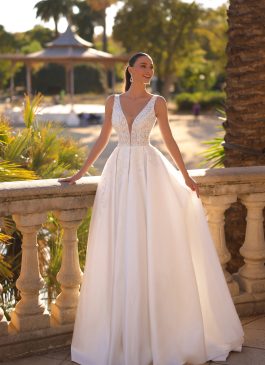 ROCHIE MIREASA DIAMONDRochia de mireasă printesa este un adevărat regal al eleganței și rafinamentului. Cu un bust cu bretele, realizat integral dintr-o dantelă fină și delicată, aceasta emană feminitate și grandoare. Dantela coboară grațios pe fusta simplă, conferind un aspect romantic și sofisticat întregii creații. Croiala de tip printesa accentuează talia și subliniază silueta, în timp ce lungimea rochiei până la podea îi conferă o vizualizare demnă de basm. O alegere perfectă pentru miresele care visează să se simtă ca adevărate prințese în ziua cea mare.