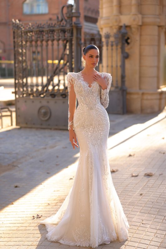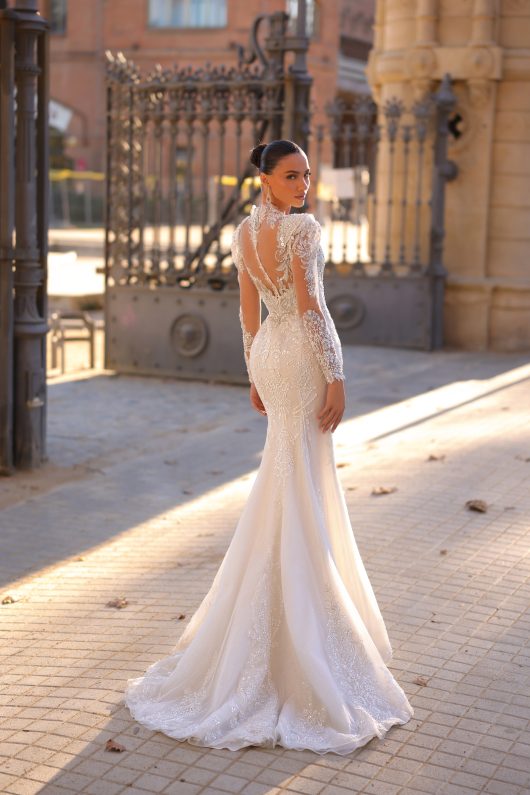 Rochia de mireasă de tip sirena este o alegere superbă pentru orice femeie îndrăzneață și elegantă. Realizată din dantelă slipitoare, aceasta emană rafinament și feminitate în fiecare cusătură. Fusta, ușor evazată în partea de jos, subliniază silueta și adaugă un aer misterios întregii apariții. Manecile lungi și umerii cu epoleti oferă un aspect clasic și sofisticat. Spatele este fermecător, închis cu nasturi, creând o imagine demnă de o prințesă modernă. Această rochie reprezintă combinația perfectă între tradiție și modernitate, transformând fiecare mireasă într-un vis împlinit.