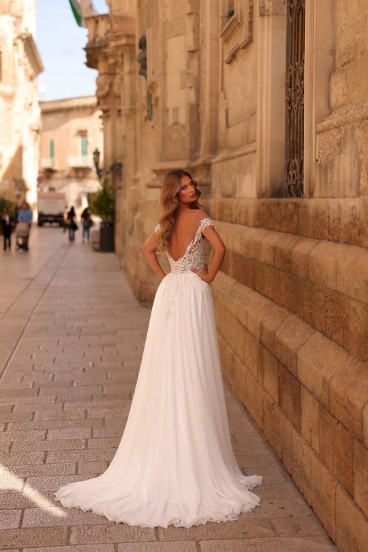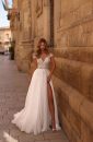 Îmbrățișează eleganța și romantismul cu această rochie de mireasă A-line, care îmbină perfect rafinamentul cu un aer de vis. Corsetul din dantelă delicată conturează silueta, adaugând un strop de feminitate, în timp ce bretelele căzute conferă un aspect boem și sofisticat. Fusta din chiffon de culoare ivory se desfășoară grațios, lăsând o dâră de eleganță la fiecare pas. Această rochie este alegerea ideală pentru o nuntă de poveste, unde fiecare detaliu strălucește de frumusețe și stil.