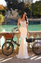 Această rochie de mireasă lungă este o alegere perfectă pentru o ceremonie sofisticată. Silueta sirenei subliniază graciozitatea și formele feminine. Corsetul este decorat cu delicate perle, adăugând o notă de strălucire și eleganță. Bretelele subțiri adaugă un aer romantic, în timp ce spatele închis cu nasturi conferă o notă de seriozitate și rafinament. Fusta simplă, fara franjuri sau volane, completează aspectul minimal și sofisticat.