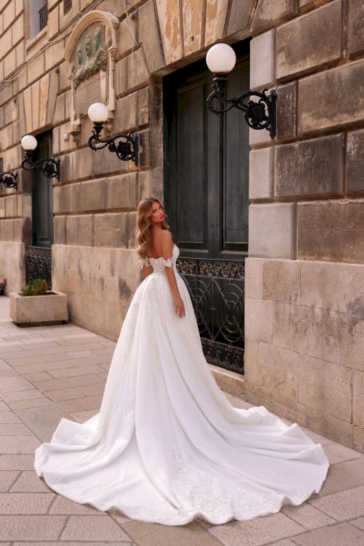 Descoperă eleganța rafinată a acestei rochii de mireasă tip sirenă, confecționată din tulle fin și decorată cu dantelă brodată, care îmbină tradiția cu un aer modern. Cupe în formă de inimă și bretele cazute, rochia îmbrățișează delicat silueta, oferind un look seducător și sofisticat. Culoarea ivory adaugă un strop de romantism, iar trena detașabilă (opțional) transformă această creație într-un vis regal, perfect pentru cea mai importantă zi din viața ta. Fii strălucitoare și unică în ziua ta specială!