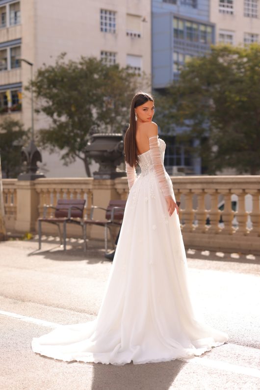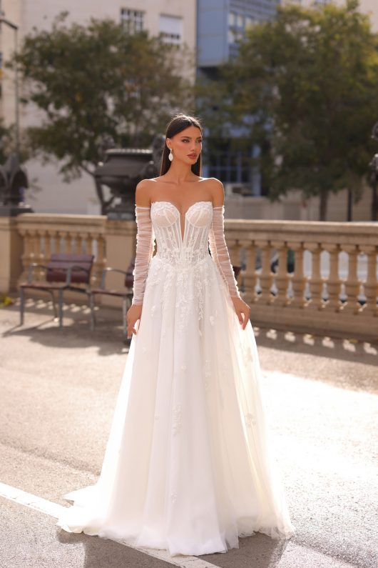 Rochia de mireasă este realizată dintr-un material fin și delicat, care se așează ușor pe corp, evidențiind silueta. Balenele prezente în corset asigură o susținere optimă, accentuând talia și conferind o postură grațioasă. Dantela prețioasă întâlnită atât pe bust, cât și pe fusta rochiei adaugă un plus de rafinament și romantism. Imbinarea perfectă dintre corsetul în formă de inimă și fusta cu croială în A transformă această rochie de mireasă într-o alegere ideală pentru orice femeie care dorește să strălucească în ziua cea mare.