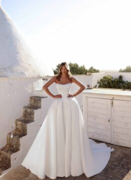 Rochia de mireasa Antigua este creata dintr-o dantela simpla din bumbac, care contrasteaza cu accesoriile din pietre din partea de sus. Bretelele fine sunt impregnate cu pietre strasuri iar pe spate se prelinge un accesoriu fin ca un lant. Spatele foarte decoltat confera rochiei senzualitate.