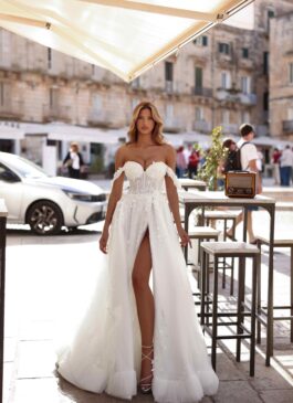 Rochia de mireasa Zanzibar este delicata si fina. Fusta simpla din tulle frantuzesc contrasteaza cu corsetul accesorizat cu dantela fina. Cupele in stil balconete sunt conturate fin punand in evidenta bustul. Rochia Zanzibar este dotata cu o trena lunga si usoara.