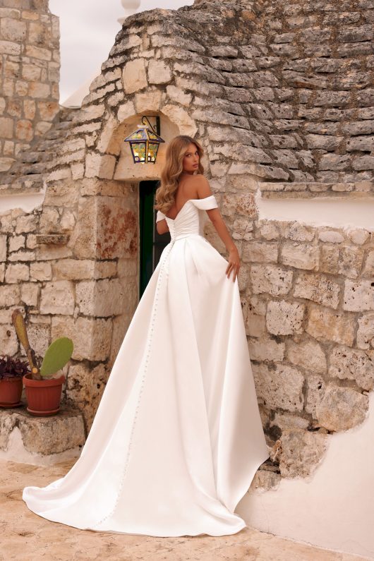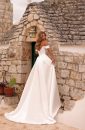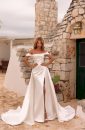Descoperă eleganța supremă cu această rochie de mireasă tip sirenă, realizată din satin mikado de cea mai bună calitate. Designul său sofisticat se evidențiază printr-o crapătură seducătoare pe picior, ce adaugă un strop de glamour. Bretelele cazute subliniază delicatețea umerilor, în timp ce opțiunea de a adăuga o trenă detașabilă conferă un plus de rafinament și versatilitate. O alegere perfectă pentru mireasa care își dorește să strălucească în cea mai importantă zi din viața ei!