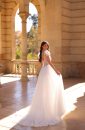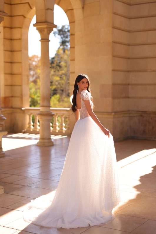 Rochia de mireasă este o creație elegantă și fermecătoare, lungă până în pământ și cu o formă prințesă. Cu un design feminin și romantic, aceasta este realizată dintr-o dantelă maruntă și sclipitoare, care adaugă o notă de glamour. Bretelele subtiri conferă o delicată eleganță, în timp ce manecile tip capac adaugă un strop de mister și sofisticare. Această rochie de mireasă de vis este potrivită pentru o domnișoară care vrea să strălucească în ziua cea mare și să impresioneze cu feminitatea ei rafinată.