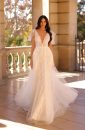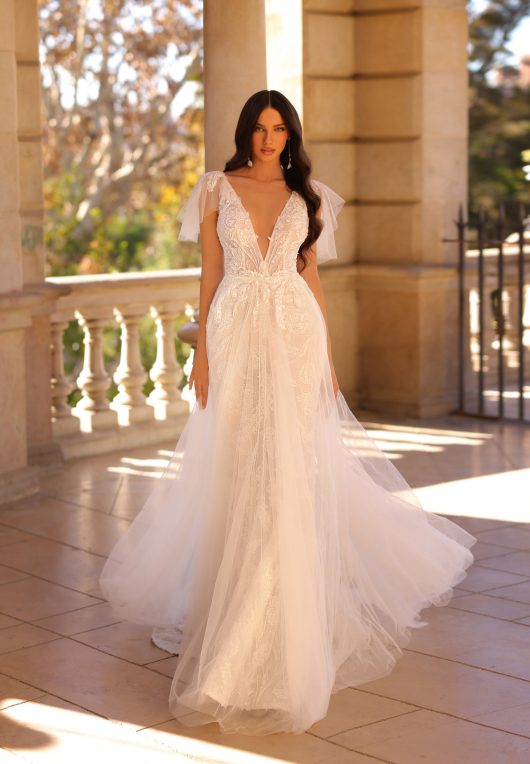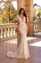 Rochia de mireasă sirena este o alegere perfectă pentru o apariție elegantă și senzuală. Cu dantelă fină împletită în modeluri delicate, conferă un aer romantic și sofisticat. Decolteul pronunțat în formă de V și spatele gol subliniază frumusețea și feminitatea. Bretelele adăugate completează designul, aducând un plus de eleganță și siguranță. Fusta din tulle transparent adaugă un efect uimitor de lejeritate și bogăție, confluență într-un amalgam perfect de stil și rafinament.