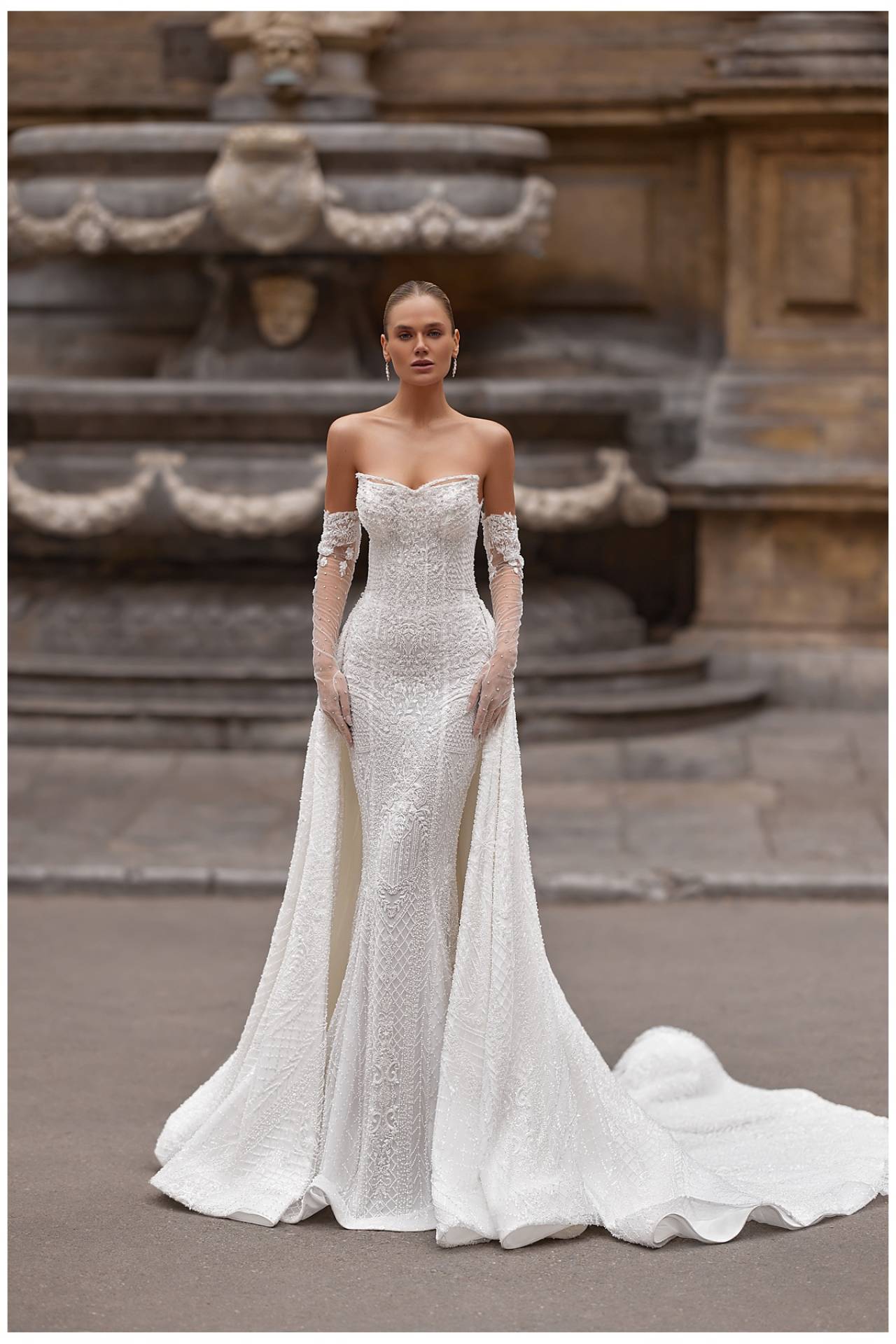Conceptul modular îmbină o rochie sirenă din broderie cu o trenă detașabilă și mâneci detașabile, permițând adaptarea ținutei în funcție de momentele-cheie ale zilei. Această flexibilitate transformă SIENNA într-o alegere ideală pentru miresele moderne, care își doresc o rochie de mireasă elegantă, dar practică, capabilă să se transforme natural de la ceremonie la petrecere.